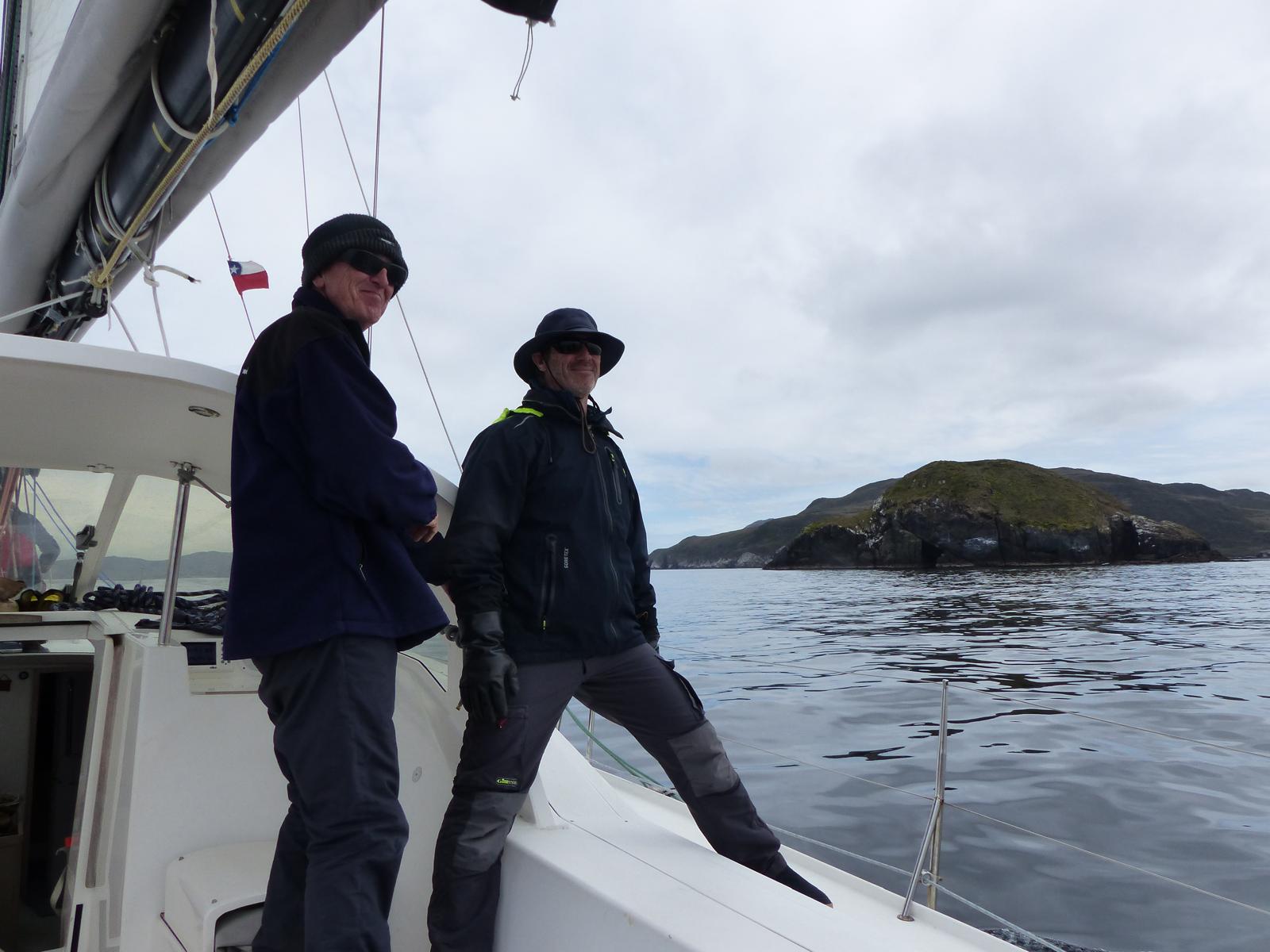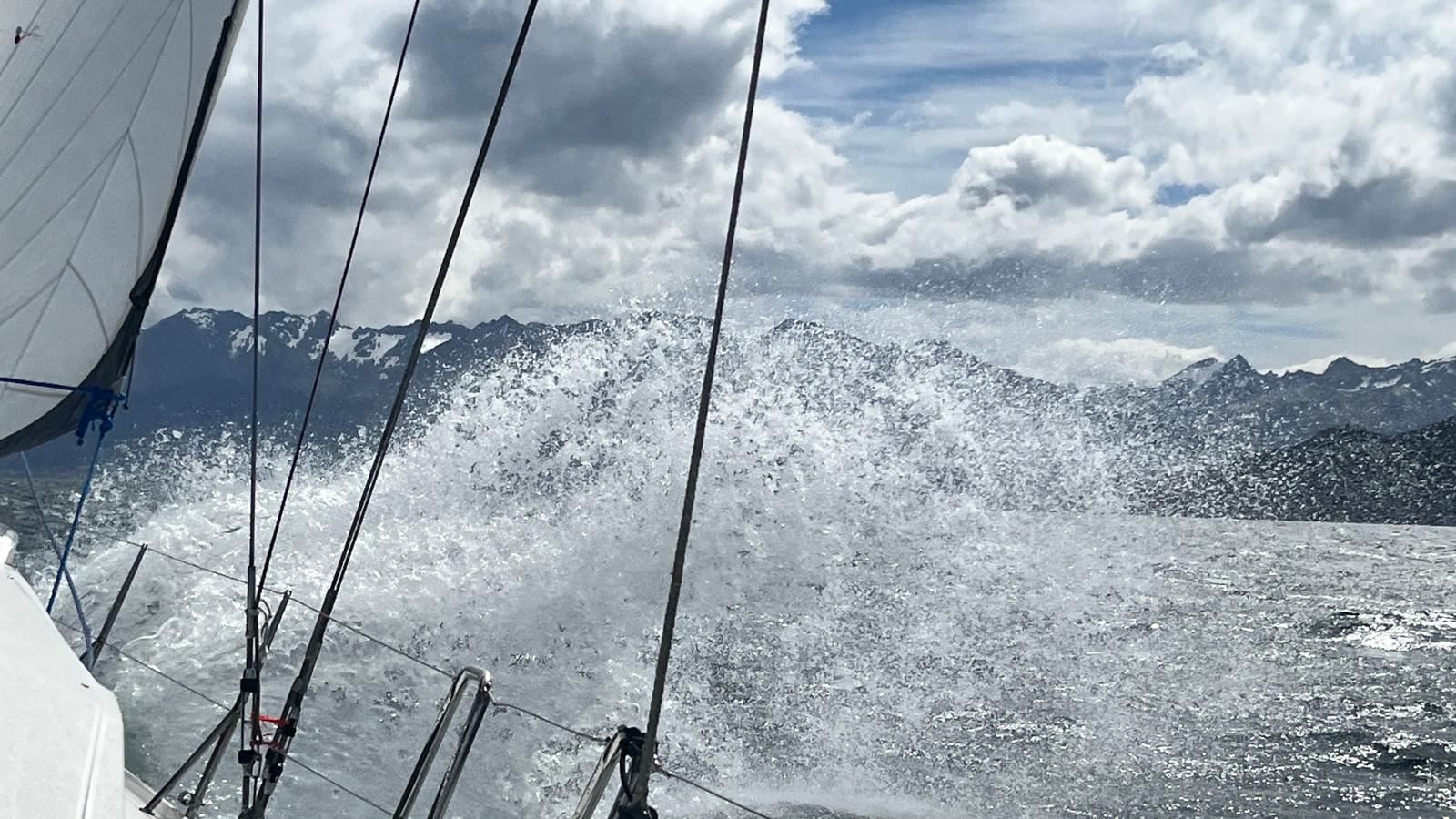 Comme prévu, l’entrée dans le canal de Magellan depuis celui de Smith se fait en mode musclé, sous la surveillance des gardiens des phares chiliens : 25 à 30 nœuds au près avec des rafales jusqu’à 35 nœuds dans les grains. Nous naviguons avec deux ris et la trinquette, avant de passer sous voile d’avant seule pour la suite, car la route est plein vent arrière. On s’est fait surprendre une fois avec la GV hissée, heureusement réduite au deuxième ris… C’est arrivé brutalement, la mer s’est mis soudain à fumer et le vent est grimpé à plus de 45 nœuds !