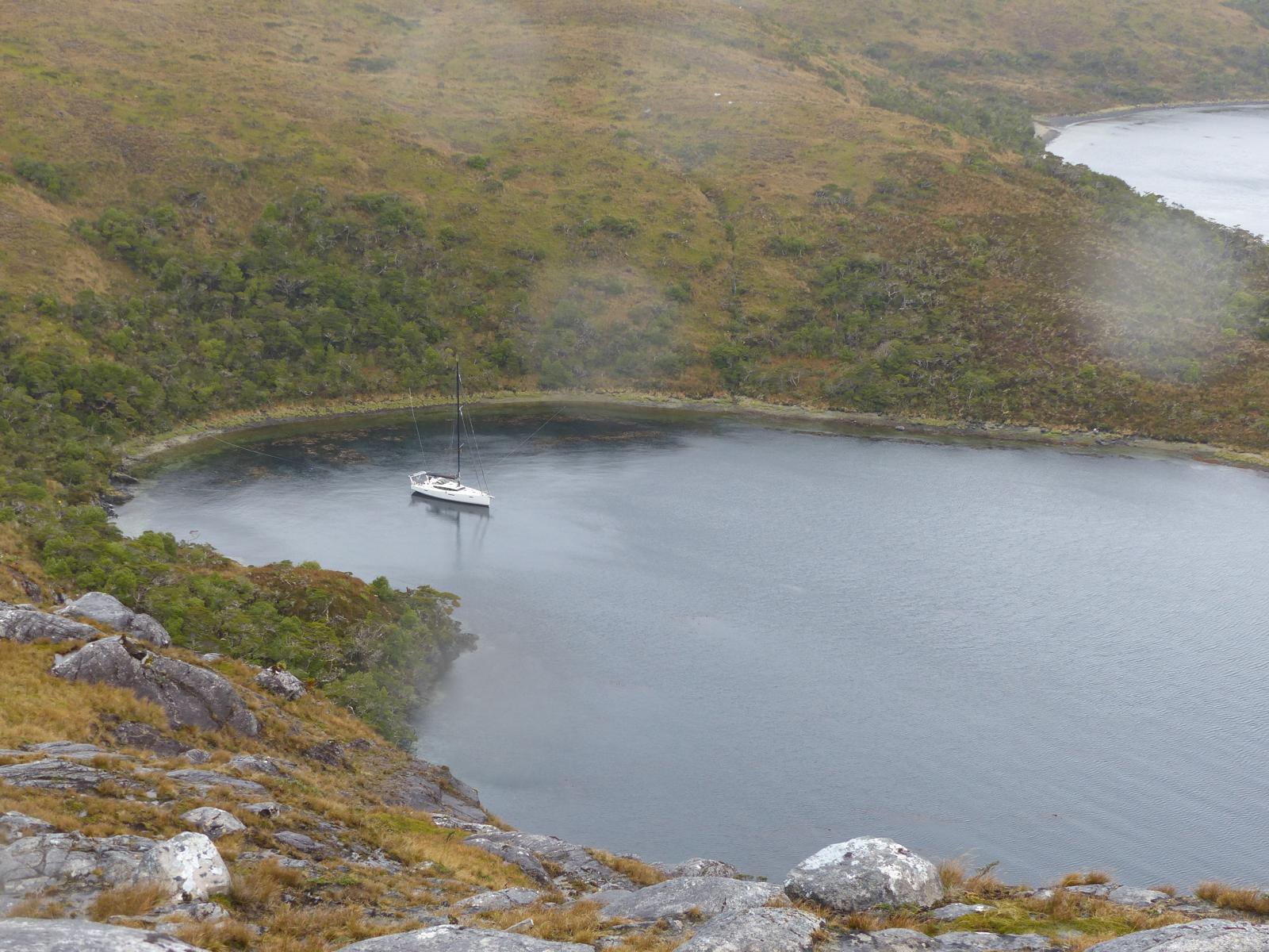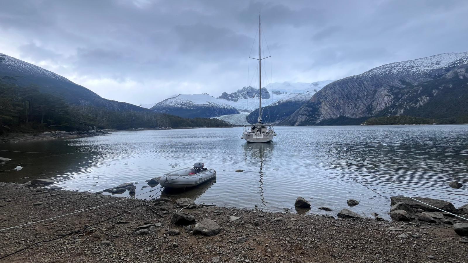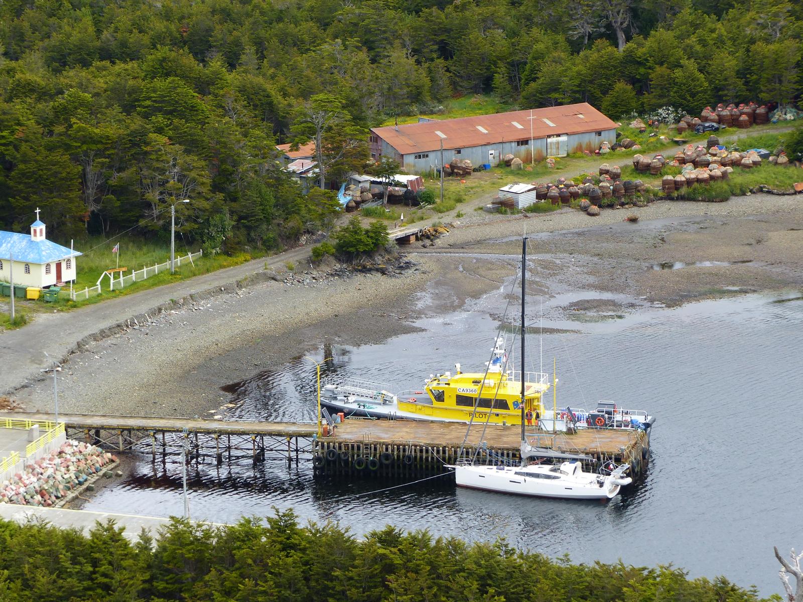 Nous avons ensuite rejoint le canal de Beagle dans sa branche nord-ouest, avec ses glaciers magnifiques et notre mouillage « Top One » : la caleta Beaulieu. Nous sommes arrivés à Puerto Williams avec un temps splendide, nous y avons amarré Belharra contre le Micalvi, pour y réveillonner [le Milcavi est un ancien ravitailleur chilien désarmé et échoué, faisant office à la fois de ponton d’amarrage et de bar, et qui a la particularité d’avoir une légère gîte à tribord… que l’on oublie après quelques verres] ! Ambiance au top avec des rencontres d’aventuriers voileux incroyables.