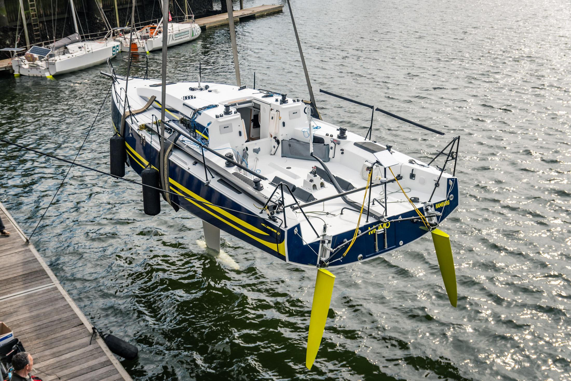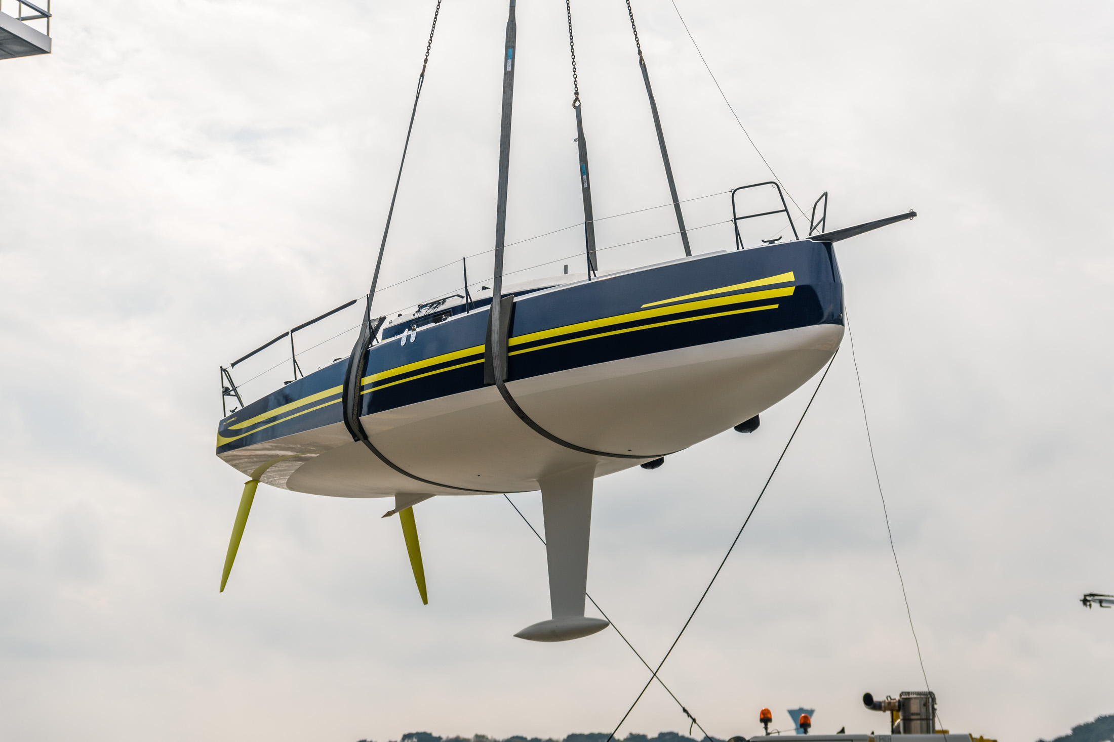 Jacques Valer a dessiné une carène très puissante, aux formes « scow » (sections avant pleines) et avec des élancements importants qui permettent au bateau d’avoir une longueur à la flottaison courte, pour optimiser son rating IRC, mais s’allongeant très vite dès les premiers degrés de gîte.